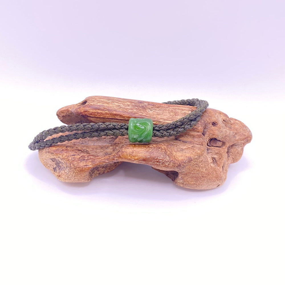 The pounamu for the bead has been collected from the West Coast of the South Island in New Zealand.