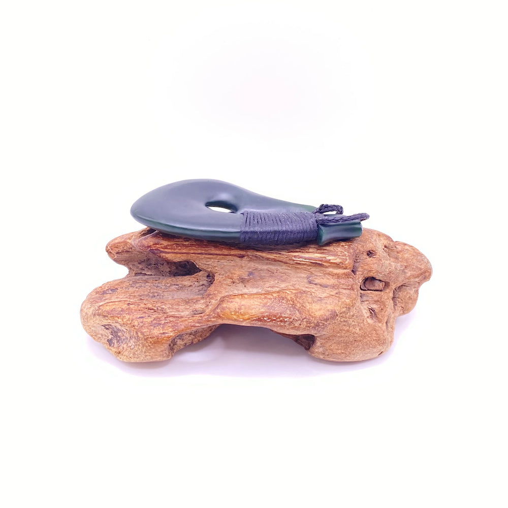 The pendant is 66mm in length and 33mm at its widest. It has the traditional ridge-knot binding at the top. This was one of the bindings used by the Maori to attach the pounamu to wooden and bone handles to use as tools and weapons.