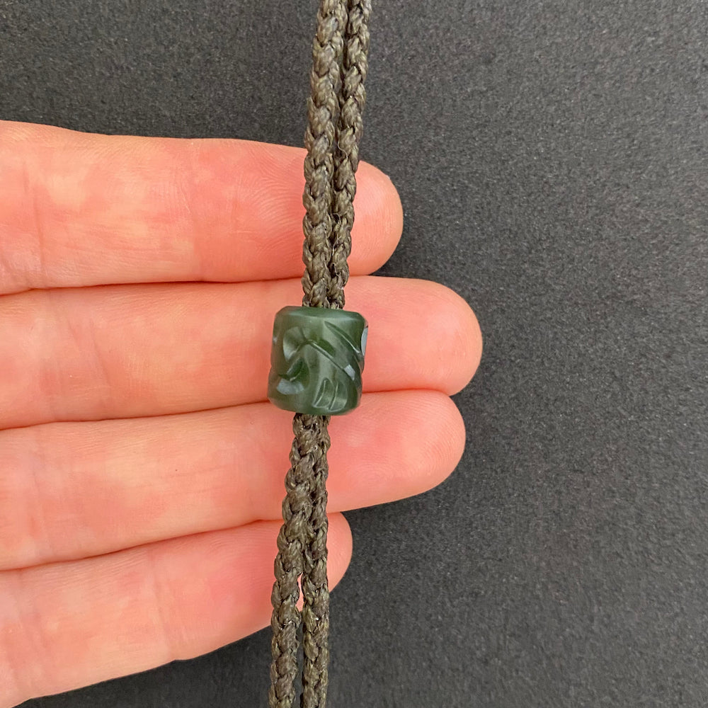 The pounamu for the bead has been collected from the West Coast of the South Island in New Zealand.