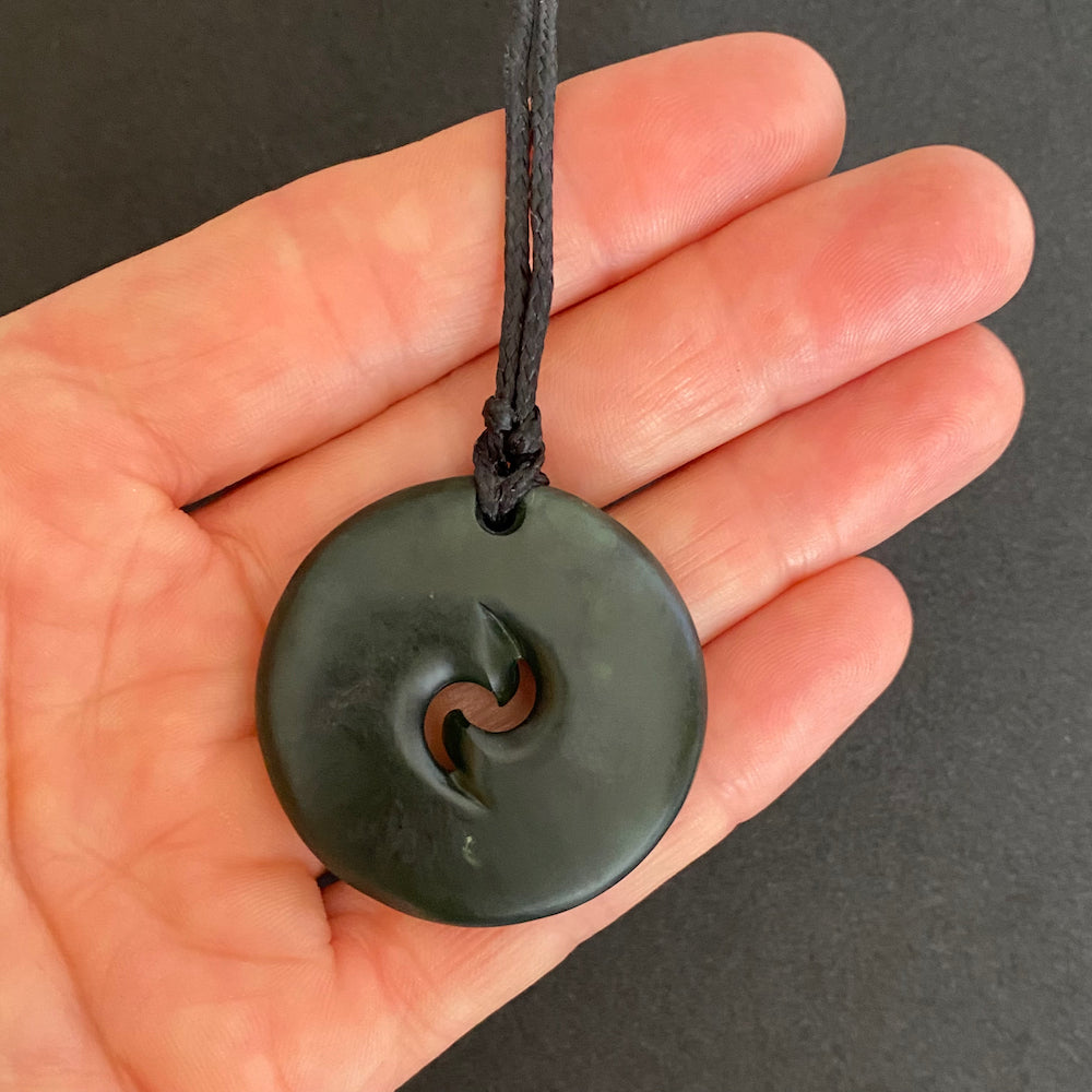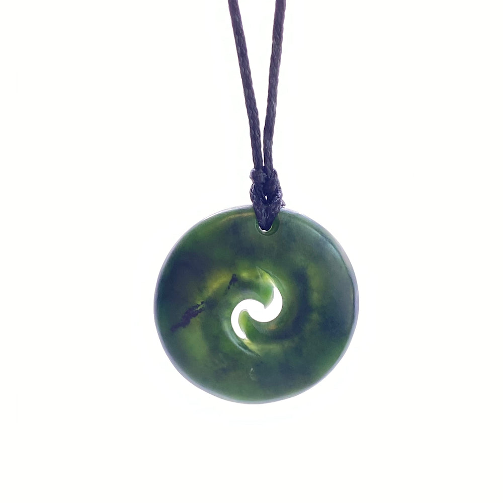 The double Koru pendant is 39mm in diameter. It is carved from pounamu we have collected from the Rimu Area just South of Hokitika, on the West Coast of the South Island in New Zealand.